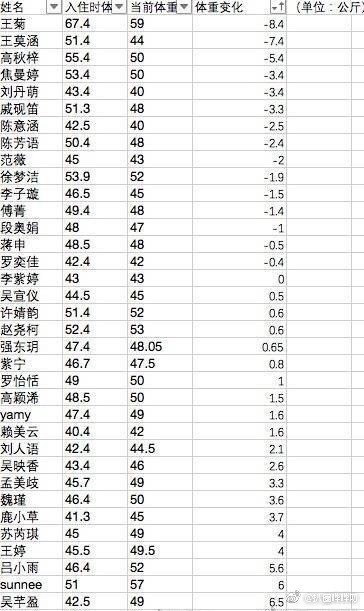 只见表格中,表格中,王菊瘦的最多,减掉了8.4斤;吴宣仪胖了0.5斤;孟美岐胖了3.3斤;sunnee胖了6斤;吴芊盈胖了6.5斤;杨超越胖的最多,足足胖了7.6斤……